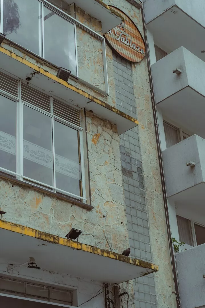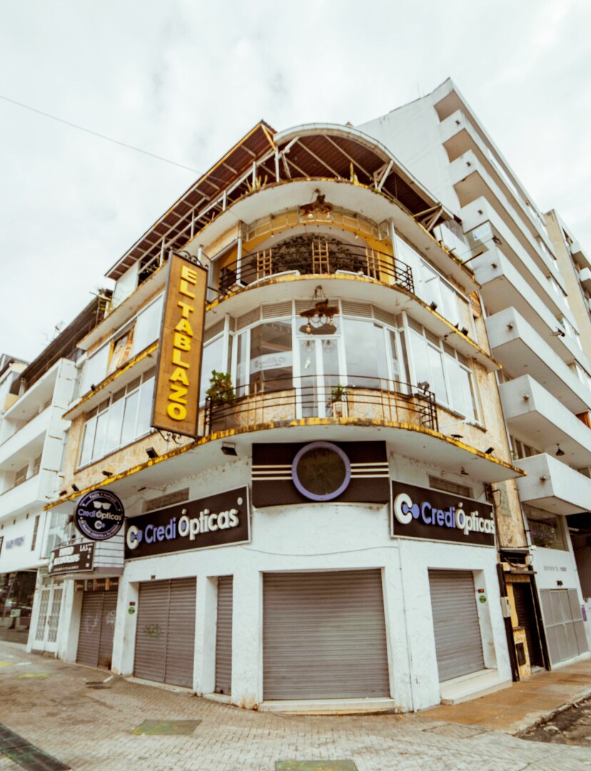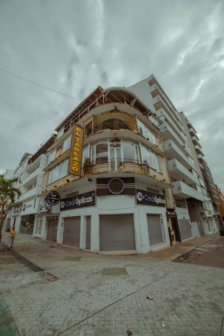 Su forma es curva en la esquina que continúa con líneas horizontales, generadas por las placas de entrepiso que sobresalen en la fachada de las tres plantas superiores de su plano vertical, generando visualmente movimiento a su fachada. En el segundo y tercer piso utilizan la parte central curva que sobresale de la placa para generar pequeños balcones con barandas metálicas simples de la época en que fue construido. Y el cuarto piso, antiguamente, era una terraza descubierta con barandas en tubos metálicos, hoy en día los tubos se conservan, pero se encuentra edificado para su uso actual. Es importante destacar que esta edificación actualmente conserva estructuralmente su sistema original.